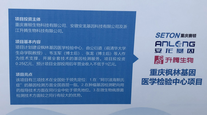 升騰生物重慶醫學檢驗中心投資金額2500萬元,預計項目年營業收入不低于人民幣1億元。 升騰生物將在重慶地區全面開展阿爾茨海默癥基因檢測、阿爾茨海默癥臨床輔助診斷檢測、腫瘤基因靶向用藥檢測等多項檢測業務。